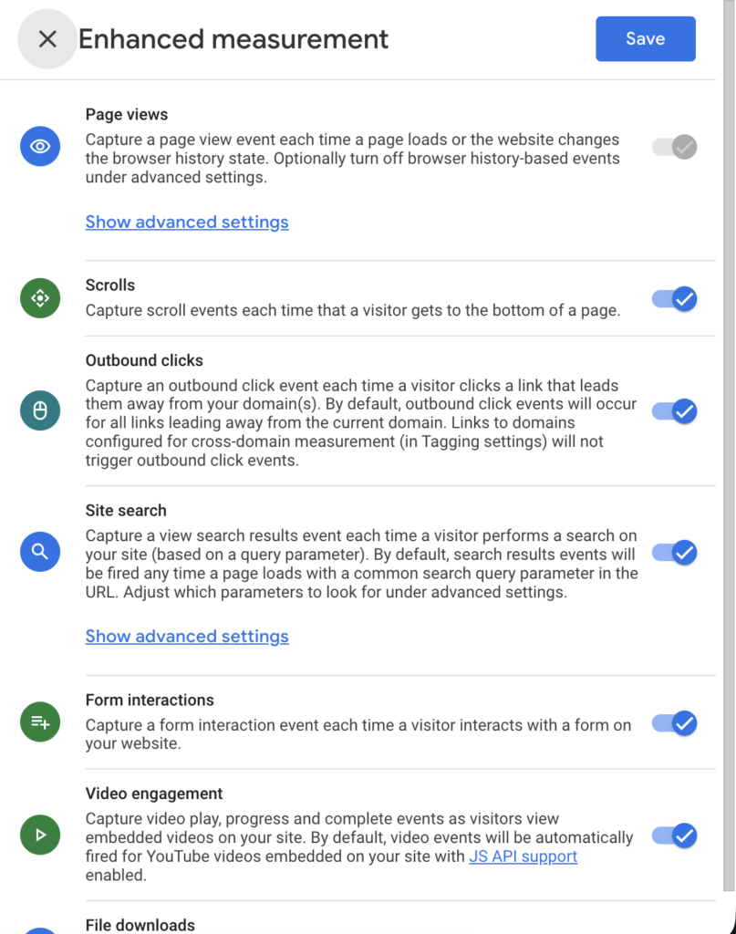 Go to Admin, then Data Streams, then click on your web stream. You will see an “Enhanced measurement” section with a list of toggles.