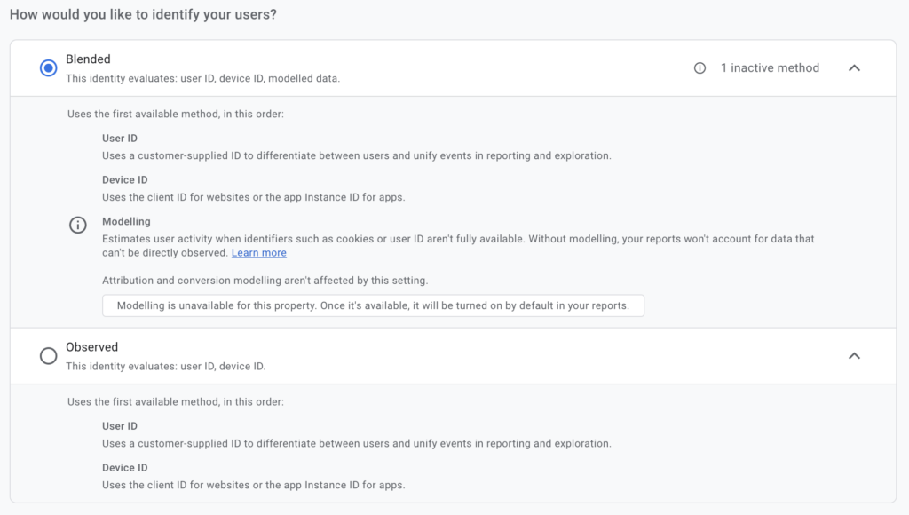 Attribution model. GA4 defaults to data-driven attribution, which uses machine learning to distribute conversion credit across touchpoints based on your actual data. For businesses with reasonable traffic volume, this is generally the right choice. But if your conversion volume is very low (a few hundred conversions a month or less), the model may not have enough signal to work effectively. The credit distribution can look inconsistent or arbitrary at low volumes. There is no single right answer here, but you should know which model is active and whether it makes sense for your data volume.